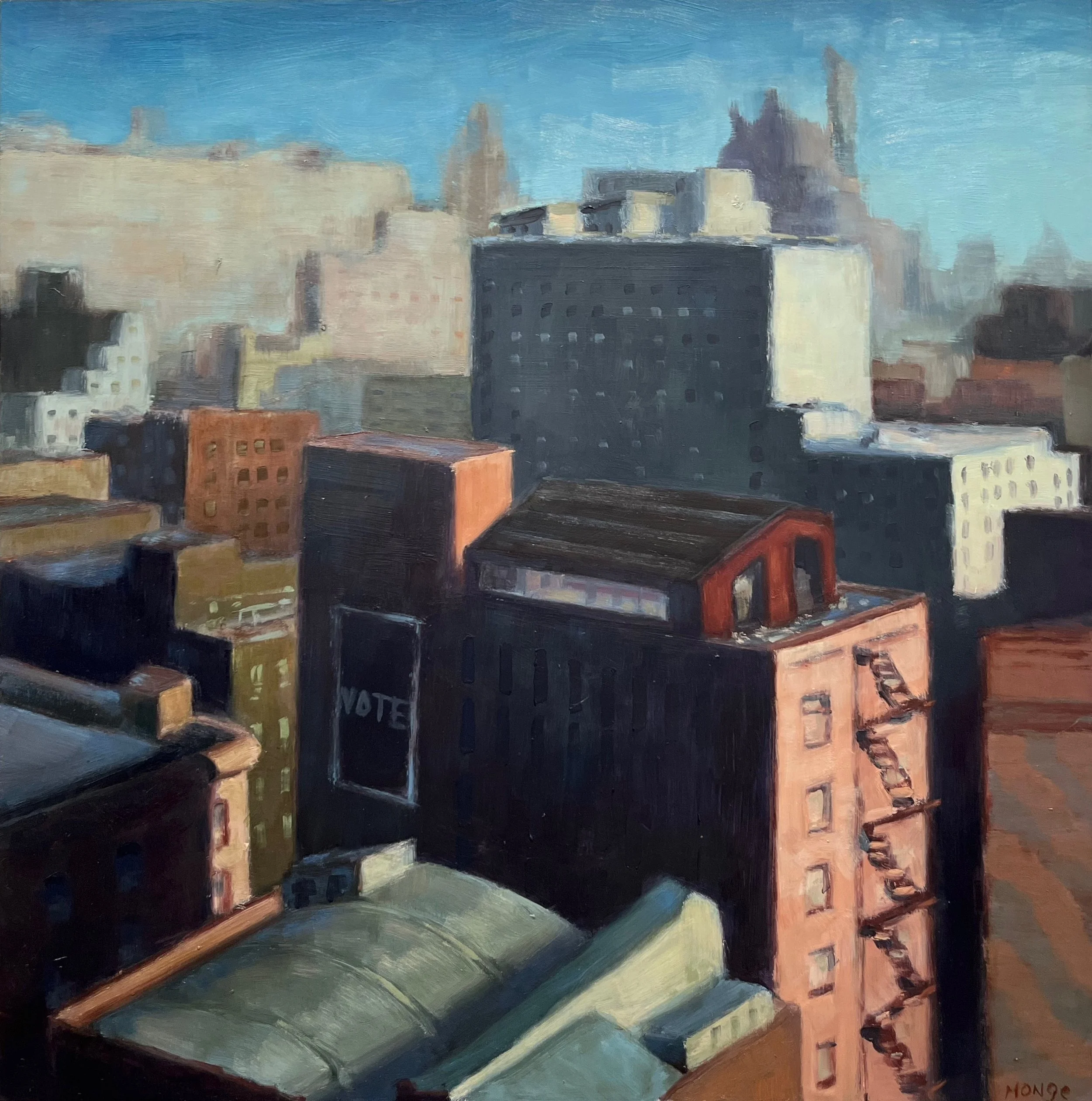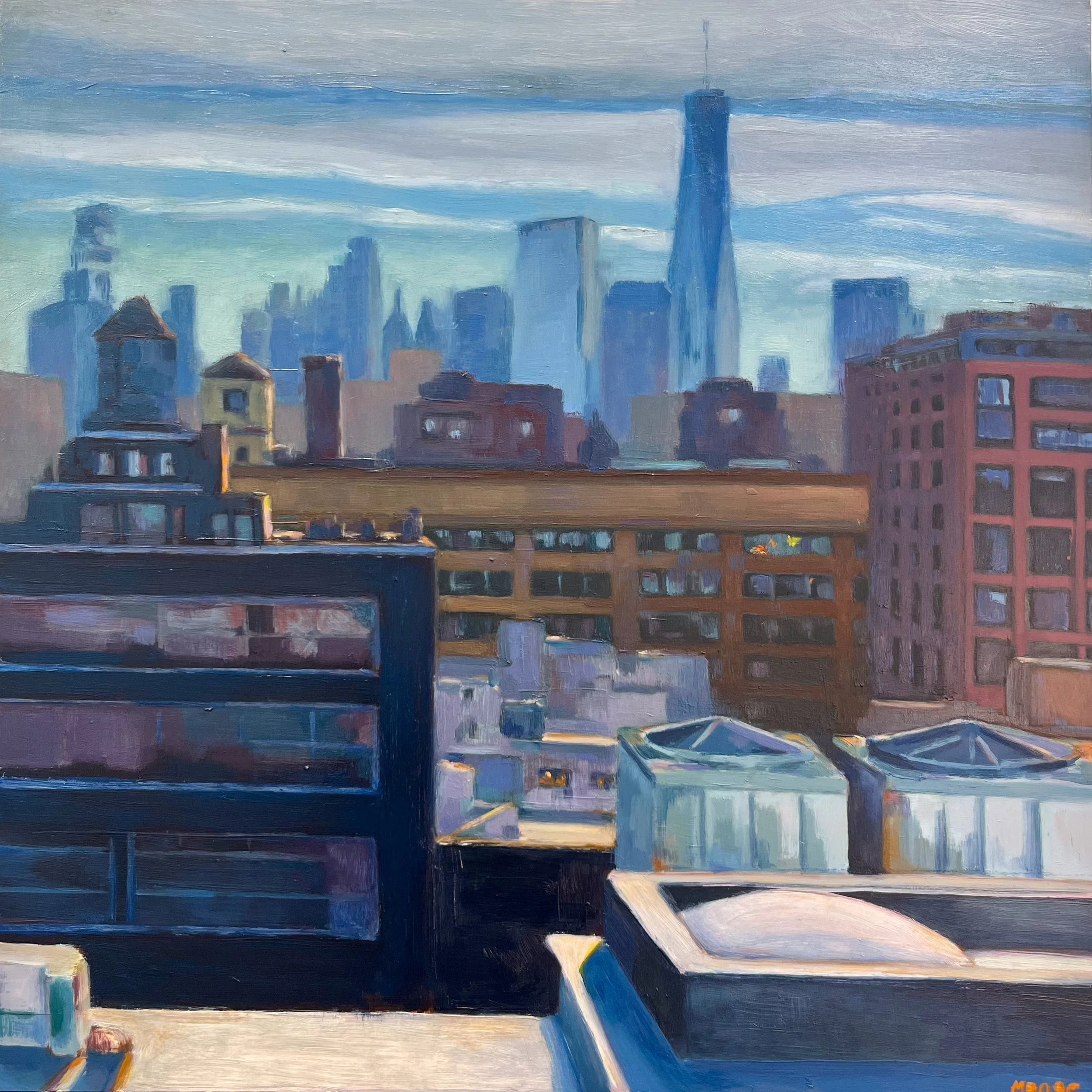 Downtown NYC From The Whitney Museum, oil on wood, 20 x 20 in, 2023